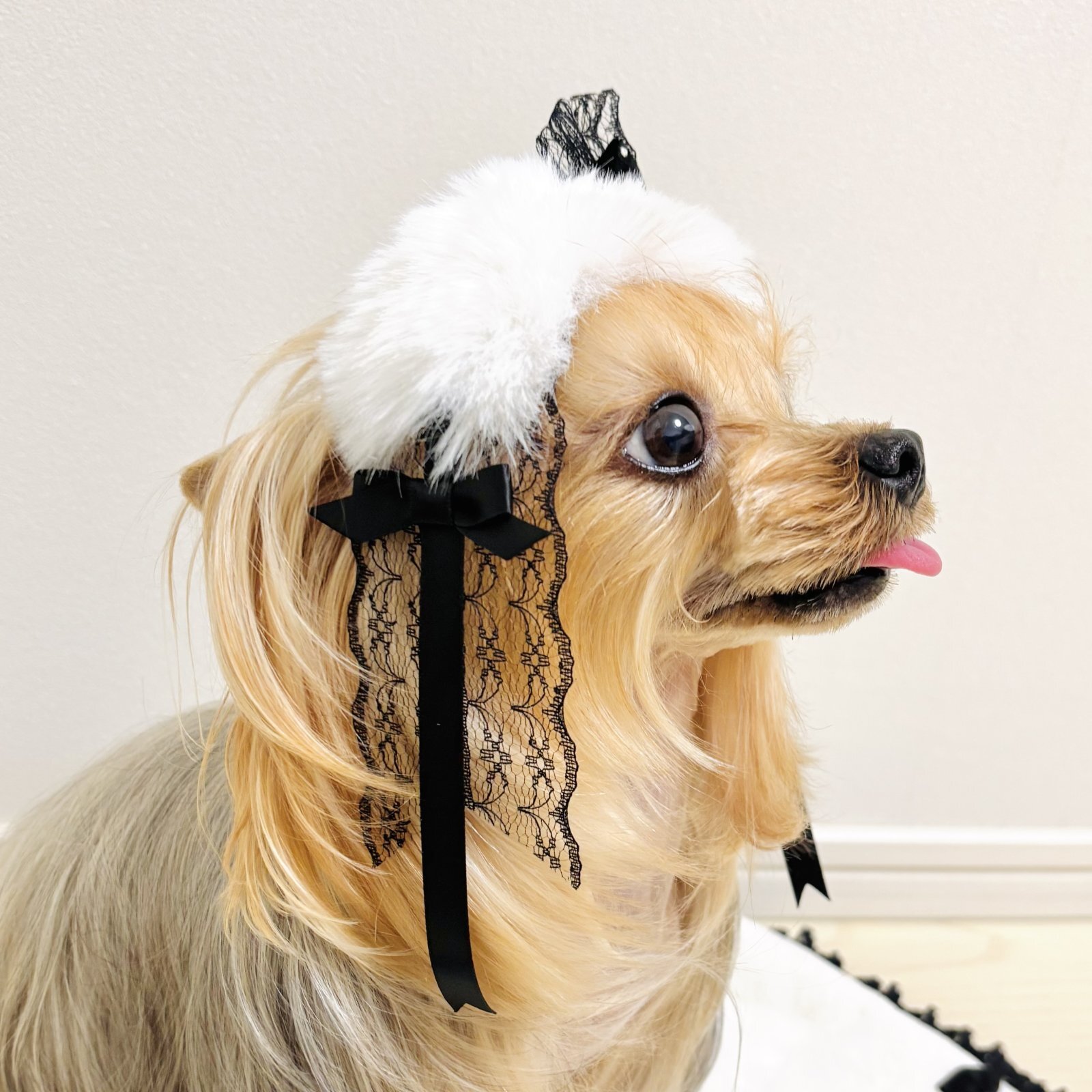 エコファーヘッドドレス・白エコファー×黒レース×黒サテン&スワロフスキーラインストーン付ベルベットリボン(JDバレッタ)