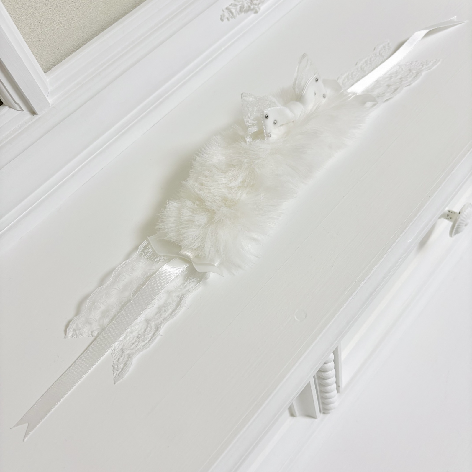 エコファーヘッドドレス・白エコファー×白レース×白サテン&スワロフスキーラインストーン付ベルベットリボン(JDバレッタ)