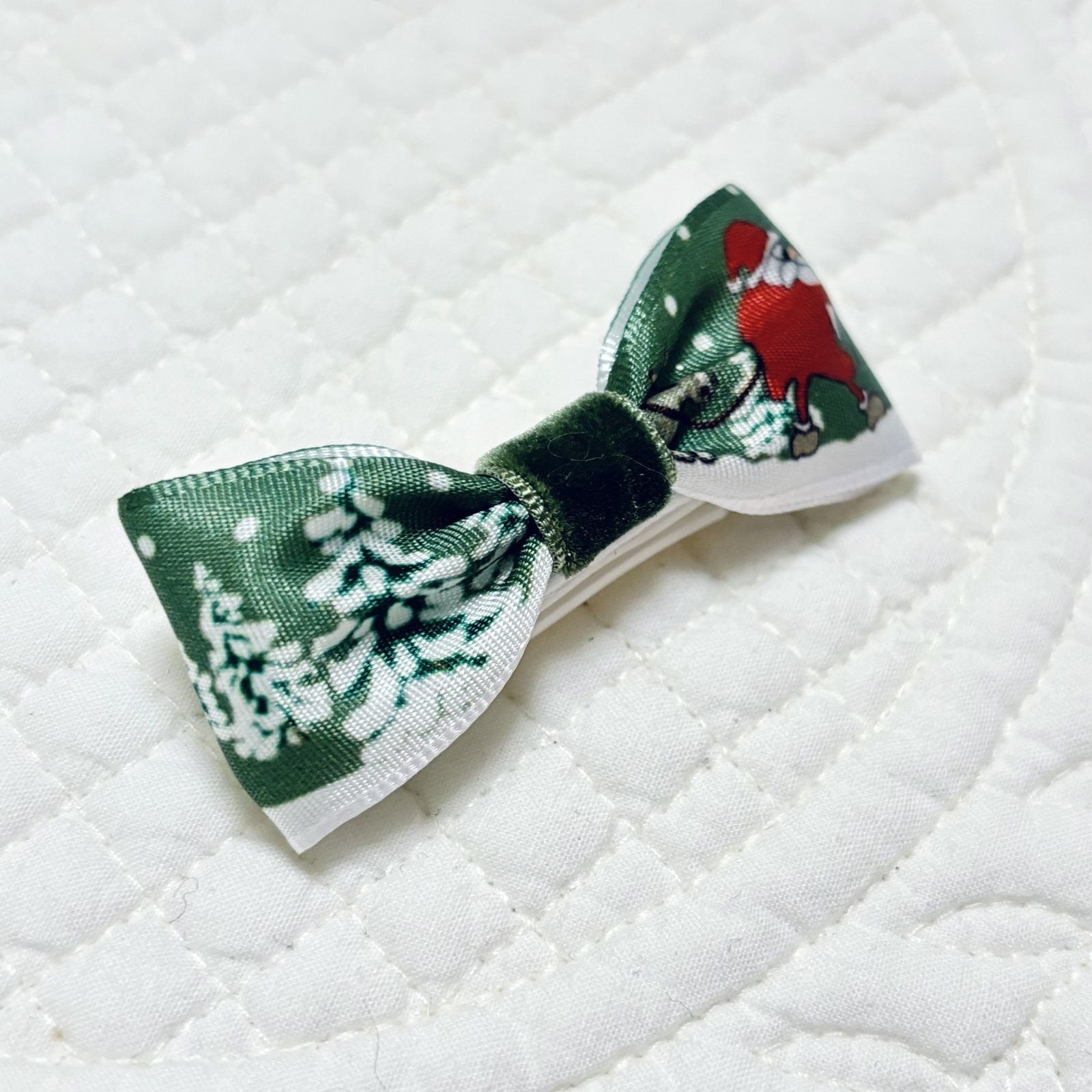 ホーム | リボン(バレッタタイプ) > クリスマス&ウィンターリボン緑地サンタクロース柄サテンリボン×モスグリーンベルベット(JDバレッタ)