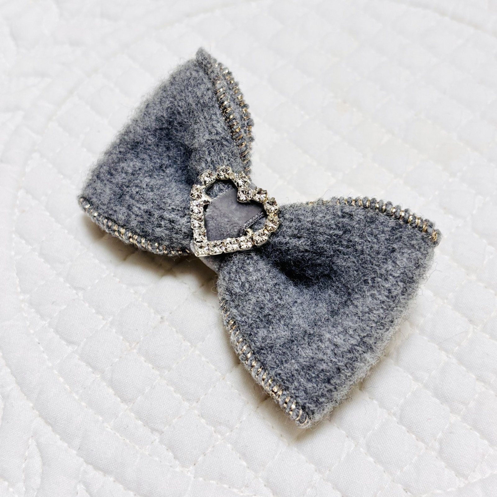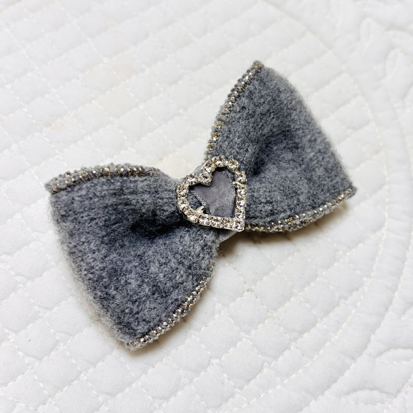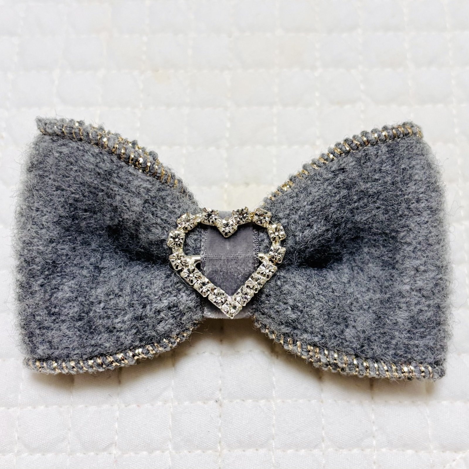 ニットリボン・グレー&シルバー地ラインストーン付ハートバックル(JDバレッタ)[u-k-146]