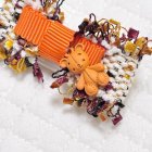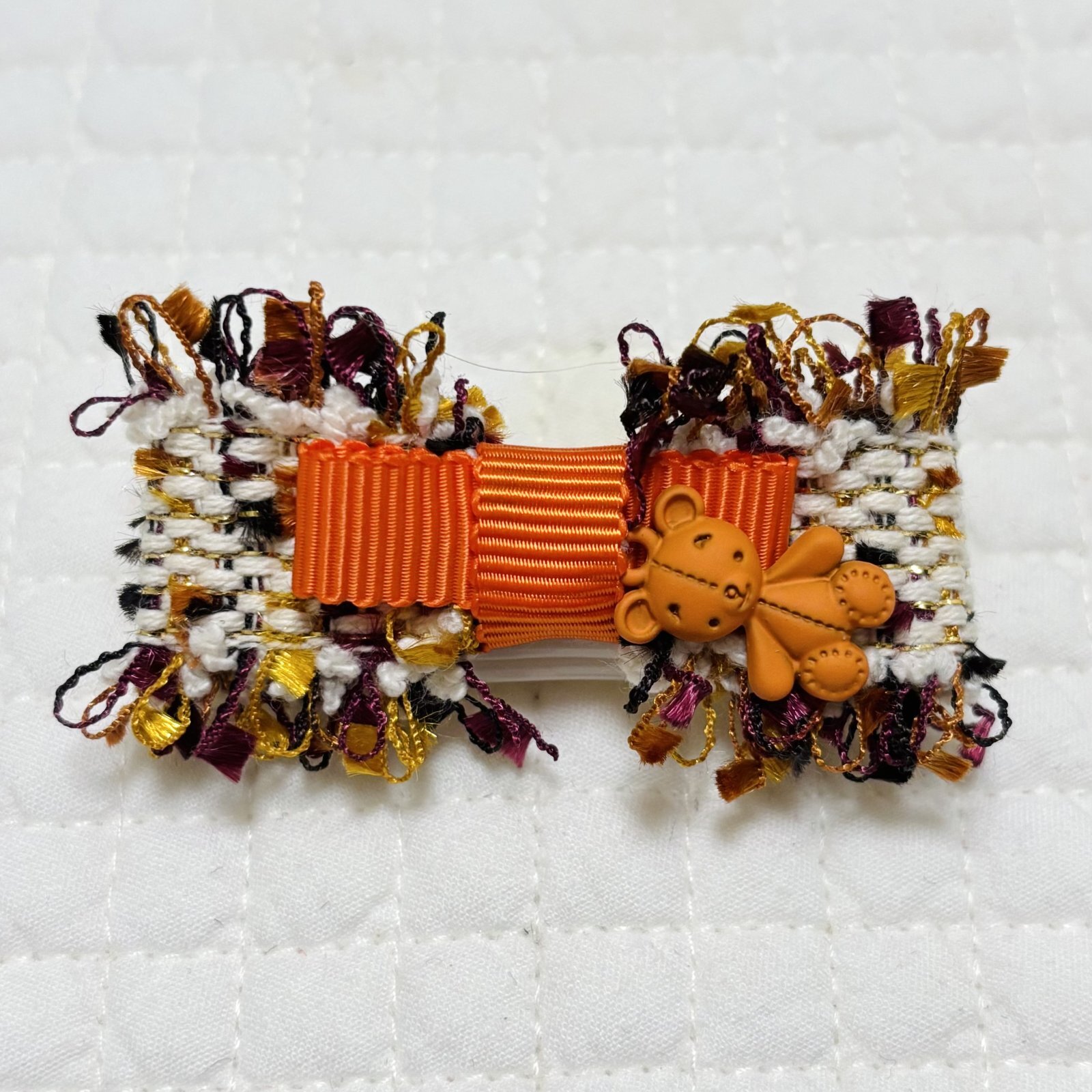 ホーム | リボン(バレッタタイプ) > 黄色・オレンジ系Wリボン・オレンジバーガンディ等秋色ツイードリボン×オレンジペタシャムグログラン&くまさんチャーム(JDバレッタ)