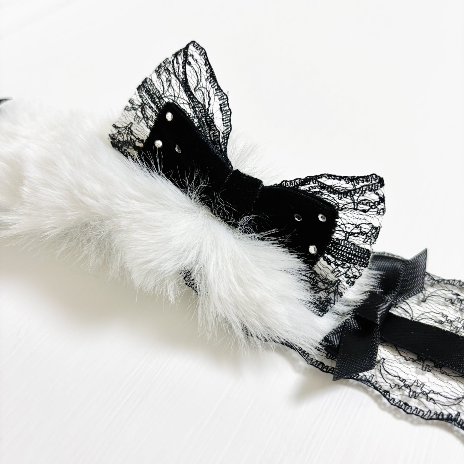 エコファーヘッドドレス・白エコファー×黒レース×黒サテン&スワロフスキーラインストーン付ベルベットリボン(JDバレッタ)[u-x-120]