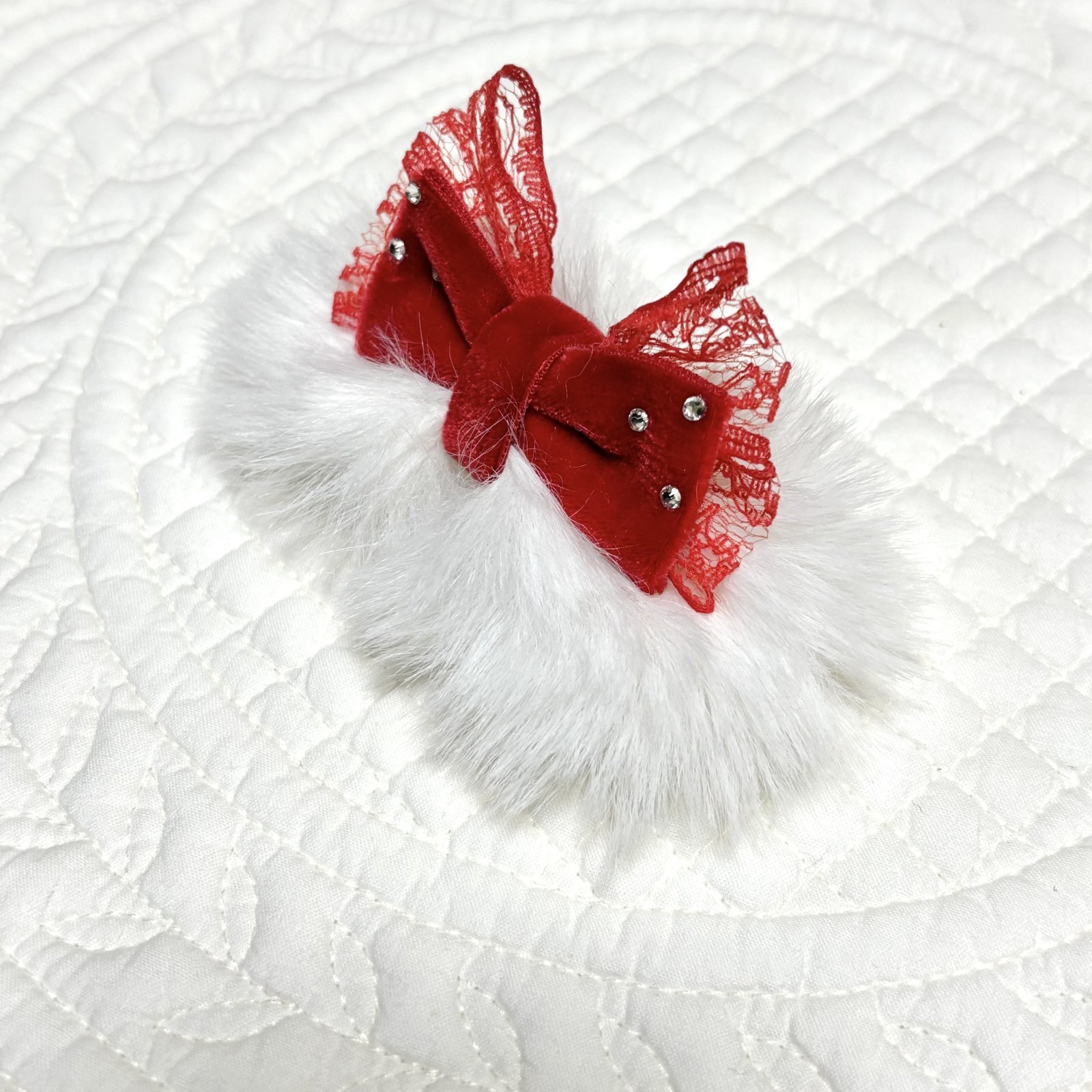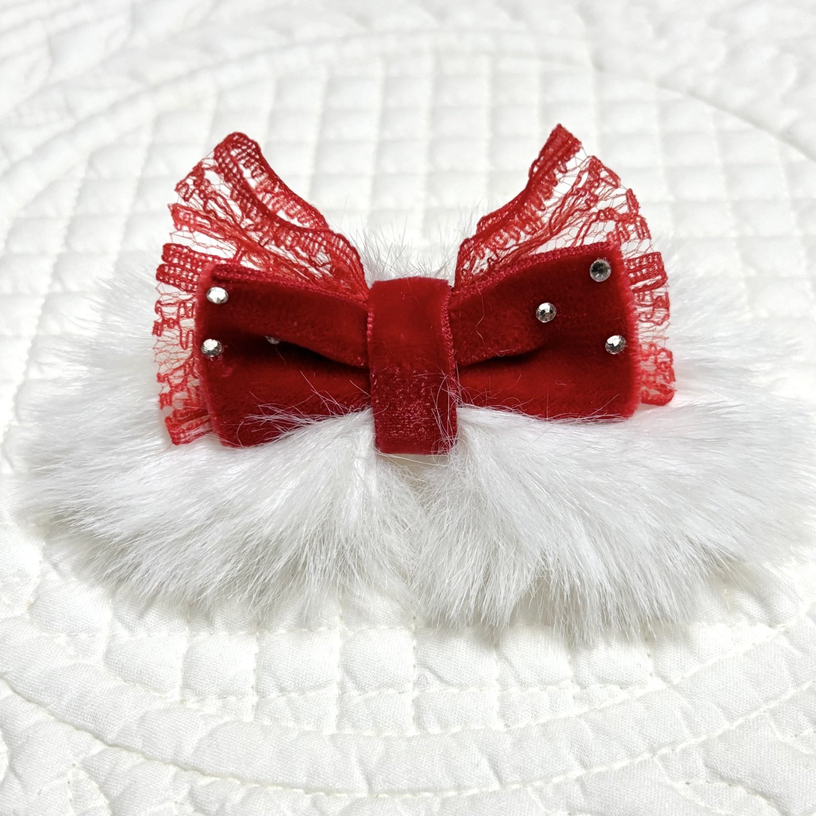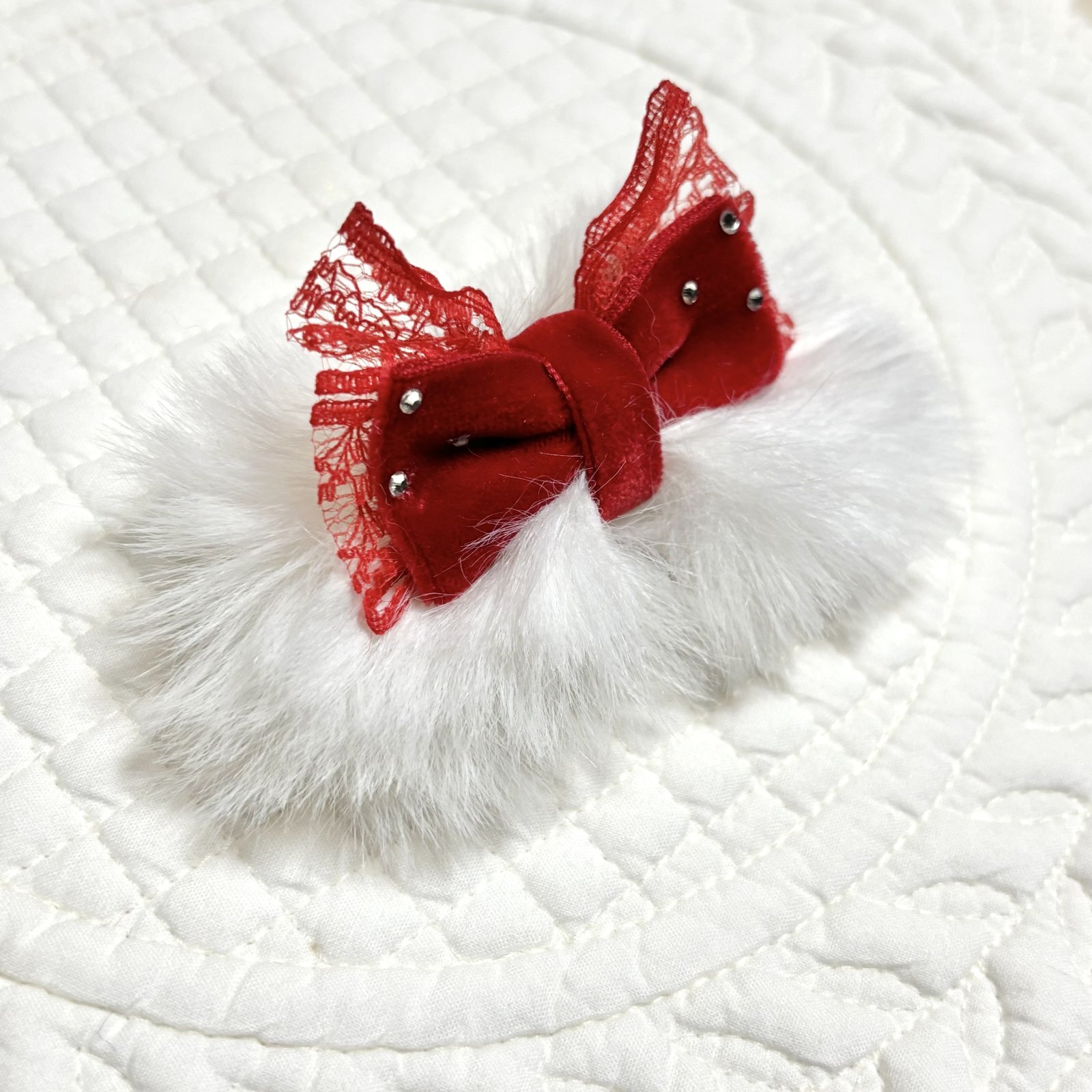 ホーム | リボン(バレッタタイプ) > クリスマス&ウィンターリボン3Dリボン・白エコファー×赤レース×スワロフスキーラインストーン付赤ベルベット(JDバレッタ)