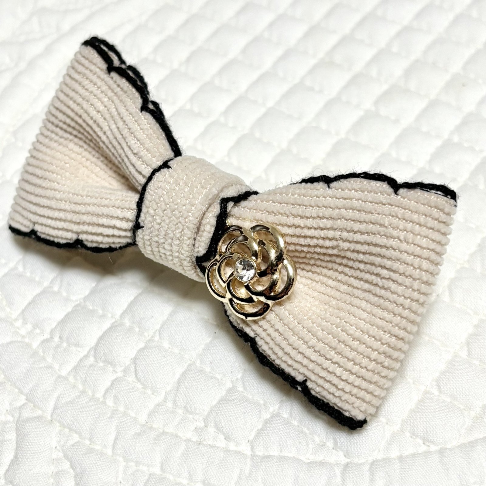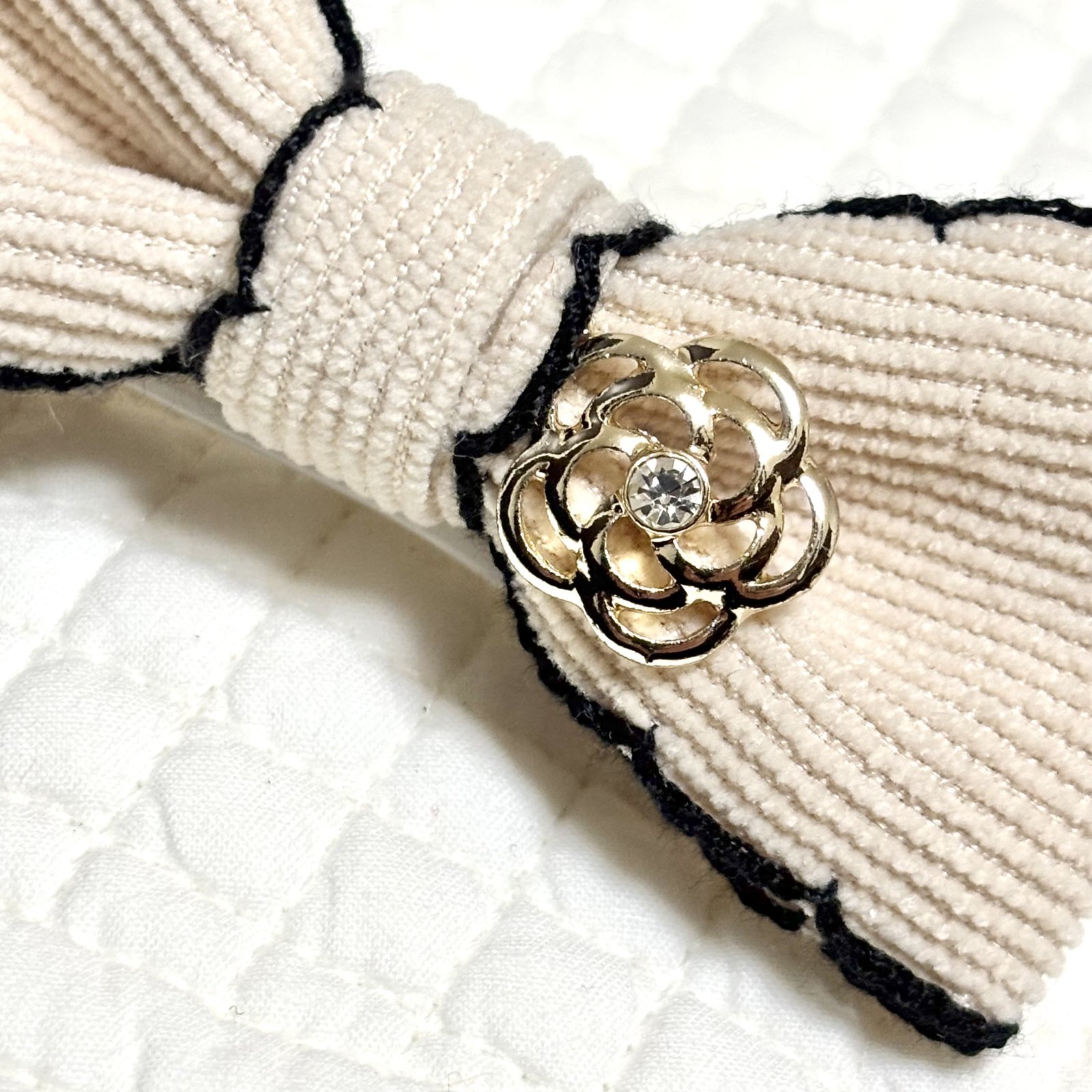 ベージュ色コーデュロイ風布リボンサイド黒ピコット&ストーン付ゴールドカラーカメリアチャーム(JDバレッタ)[u-c-116]