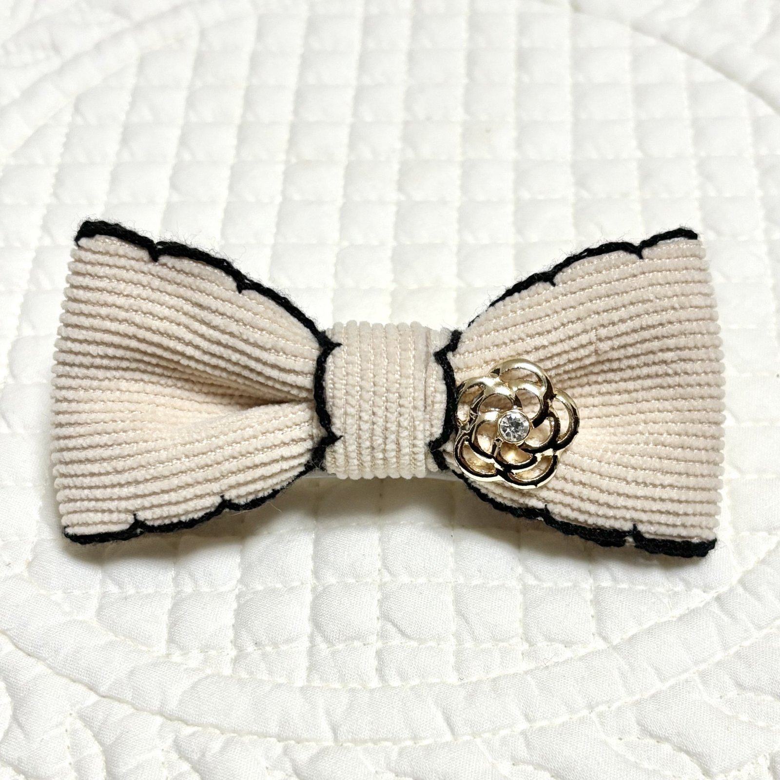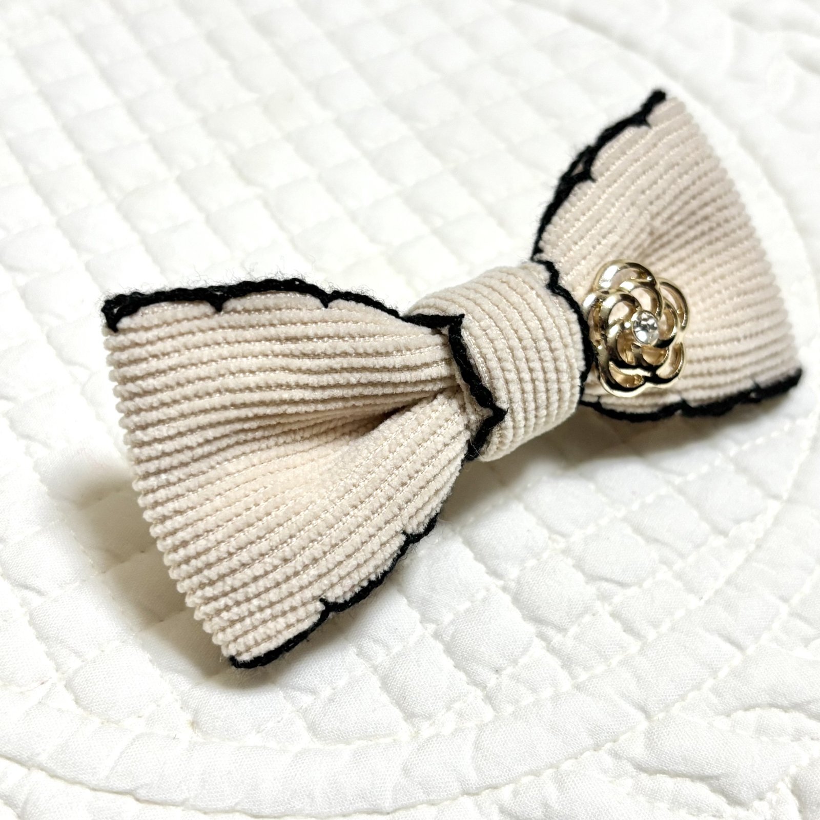 ホーム | リボン(バレッタタイプ) > ブラウン系ベージュ色コーデュロイ風布リボンサイド黒ピコット&ストーン付ゴールドカラーカメリアチャーム(JDバレッタ)